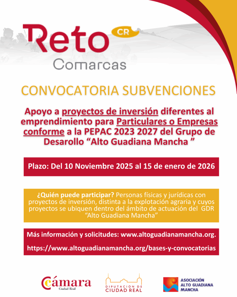 La Asociación para el Desarrollo del Alto Guadiana Mancha ha publicado la Convocatoria 3-2025 de ayudas LEADER, dirigida a particulares, autónomas y empresas que deseen realizar inversiones en los municipios: Alhambra, Arenas de San Juan, Argamasilla de Alba, Carrizosa, Daimiel, La Solana, Las Labores, Llanos del Caudillo, Manzanares, Membrilla, Herrera de la Mancha, Puerto Lápice, […]